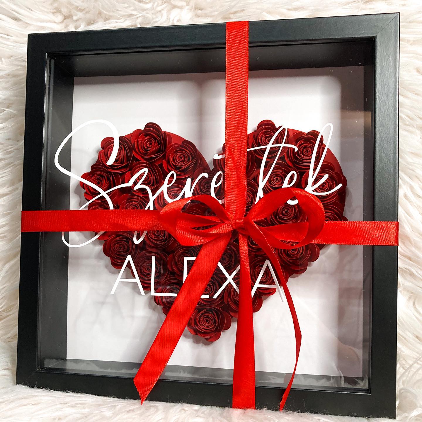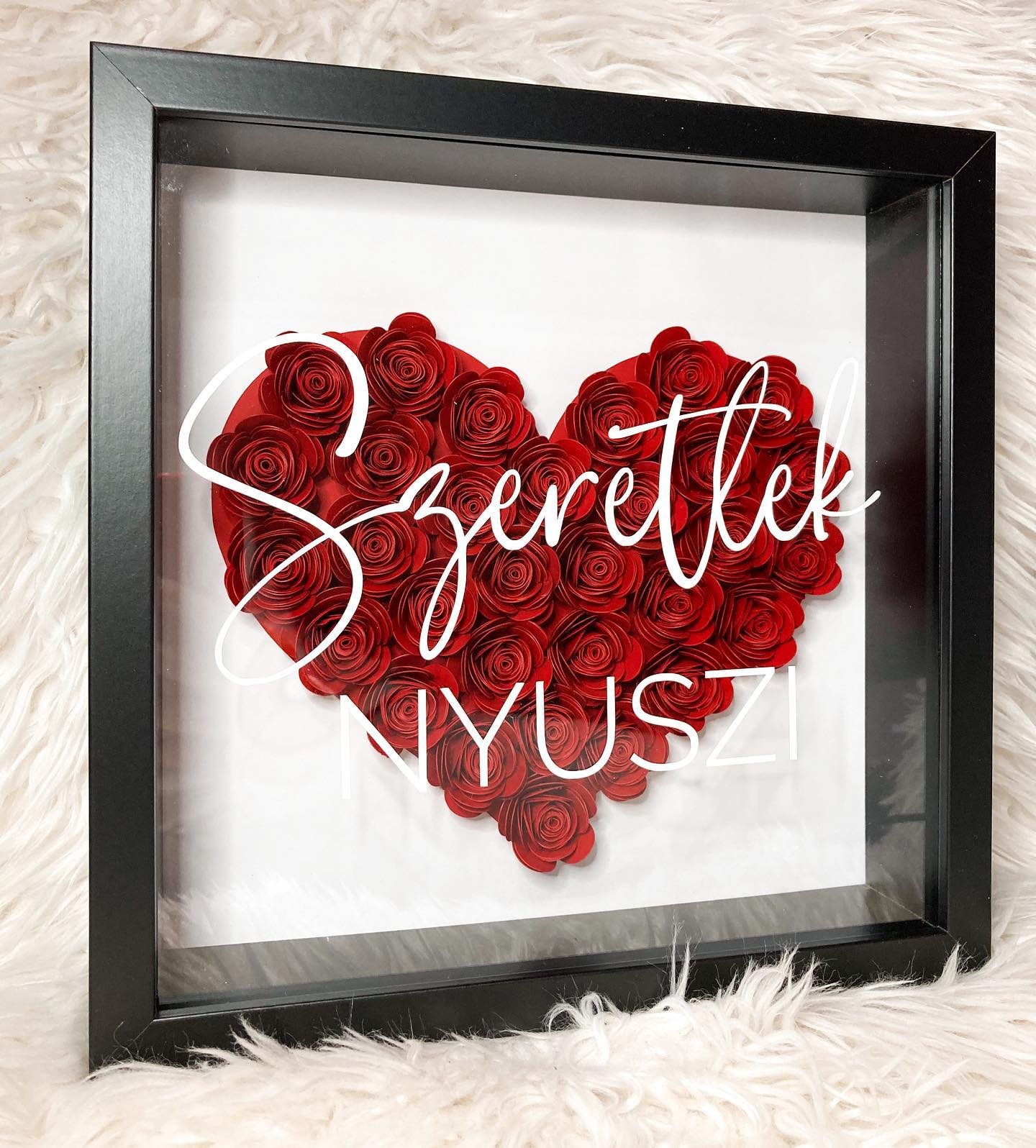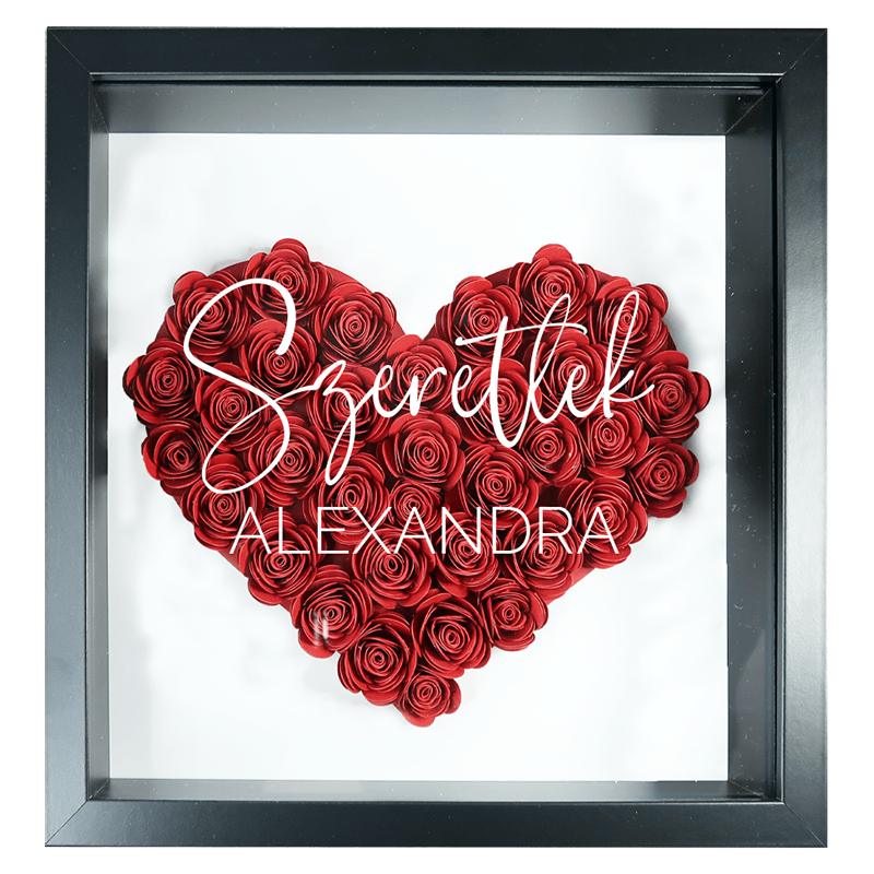 Ez egy teljes egészében kézzel készült, papírvirágokkal díszített, zárt képkeret box, személyre szabott feliratozással.
